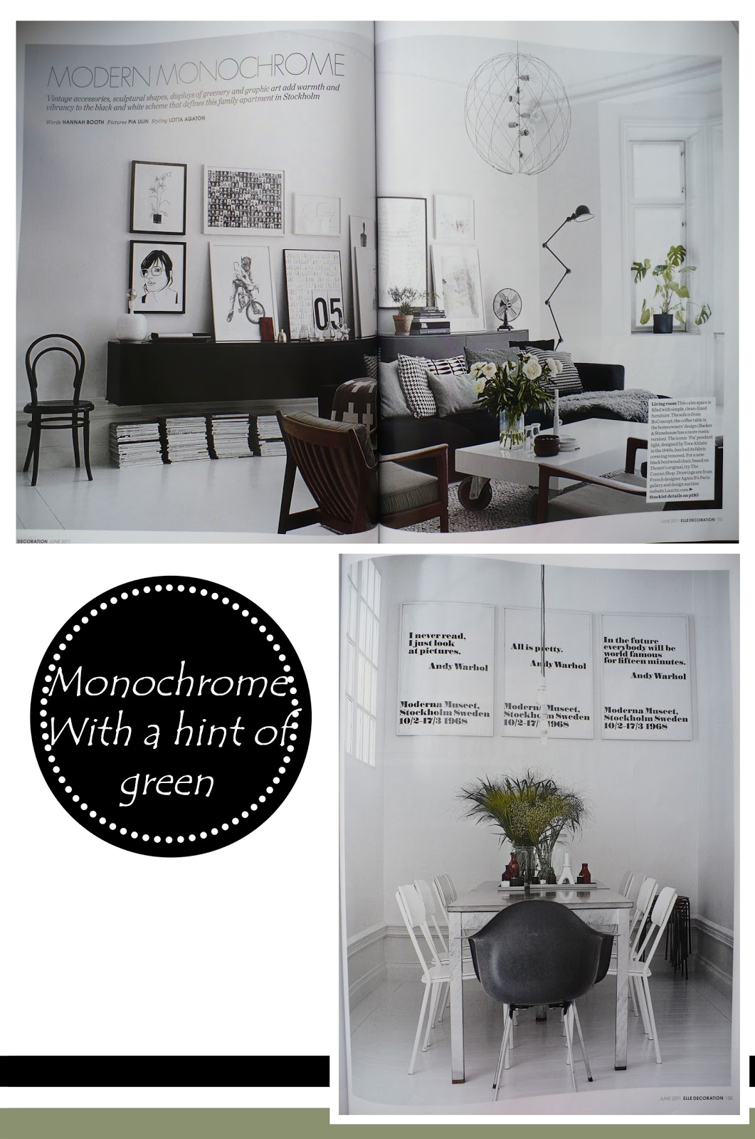 I'm currently in the middle of a make over in our living room as I type, (stopping every so often to scan the room and work on ideas in my head, magazine in hand) so I have been checking out ideas to steal from the home of fashion Stylist Sofia Ericson and her photographer husband Nils Odier, featured in Elle Decoration this month, an all black and white interior with a hint of green.